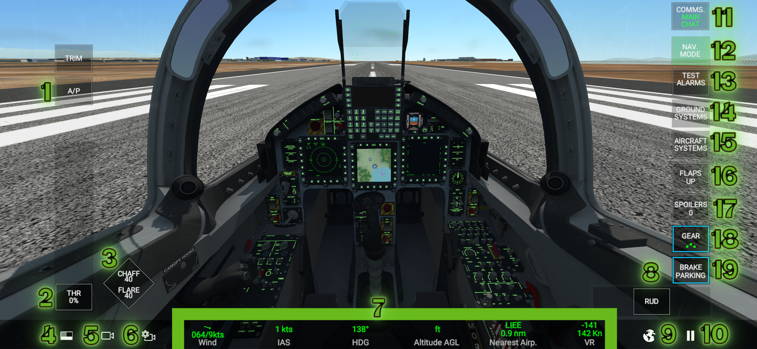 In RCS most of your time you'll spend in front of your cockpit, so it is very important to know which button does what. Here's a screenshot from the game, and below is a complete explanation of each interactive element in the Real Combat Simulator cockpit view:
